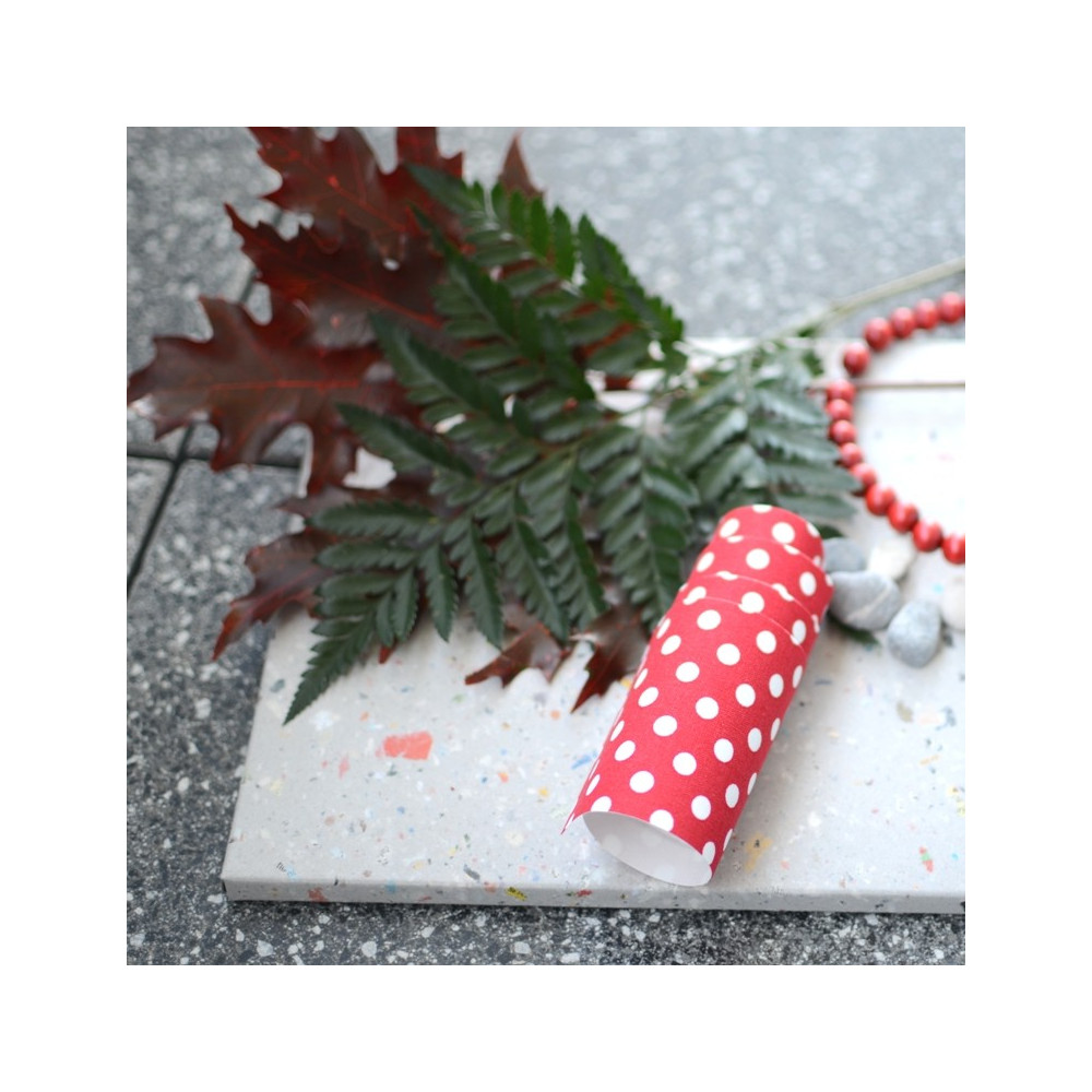 Samolepící látková páska s motivem bílých puntíků na červené. Jde snadno nastříhat na menší dílky a vytvořit tak vlastní vzor. Po zažehlení na látku lze pásku prát.