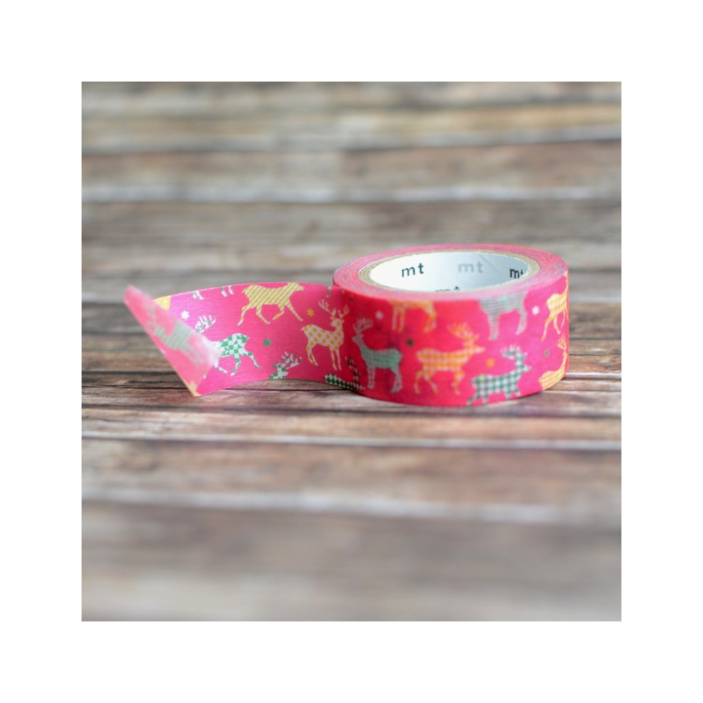 Vánoční washi páska s motivem sobíka na růžovém podkladu.